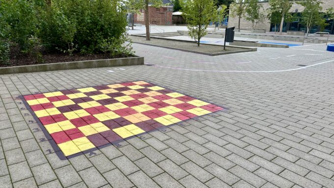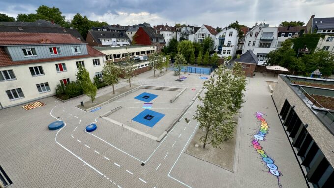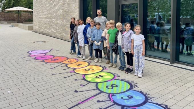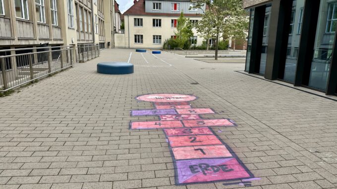 In den Ferien haben Kinder zusammen mit Bennet Dartmann den Schulhof bemalt. Im Rahmen der Ferienbetreuung wurden ein Schachbrett, mehrere Hüpfspiele, ein Basketballfeld und Straßen für die Fahrzeuge der OGS aufgesprüht. Schachfiguren für das Schachfeld treffen in den nächsten Tagen ein. Das alles hat der Förderverein der Kreuzschule finanziert! Herzlichen Dank dafür!!!